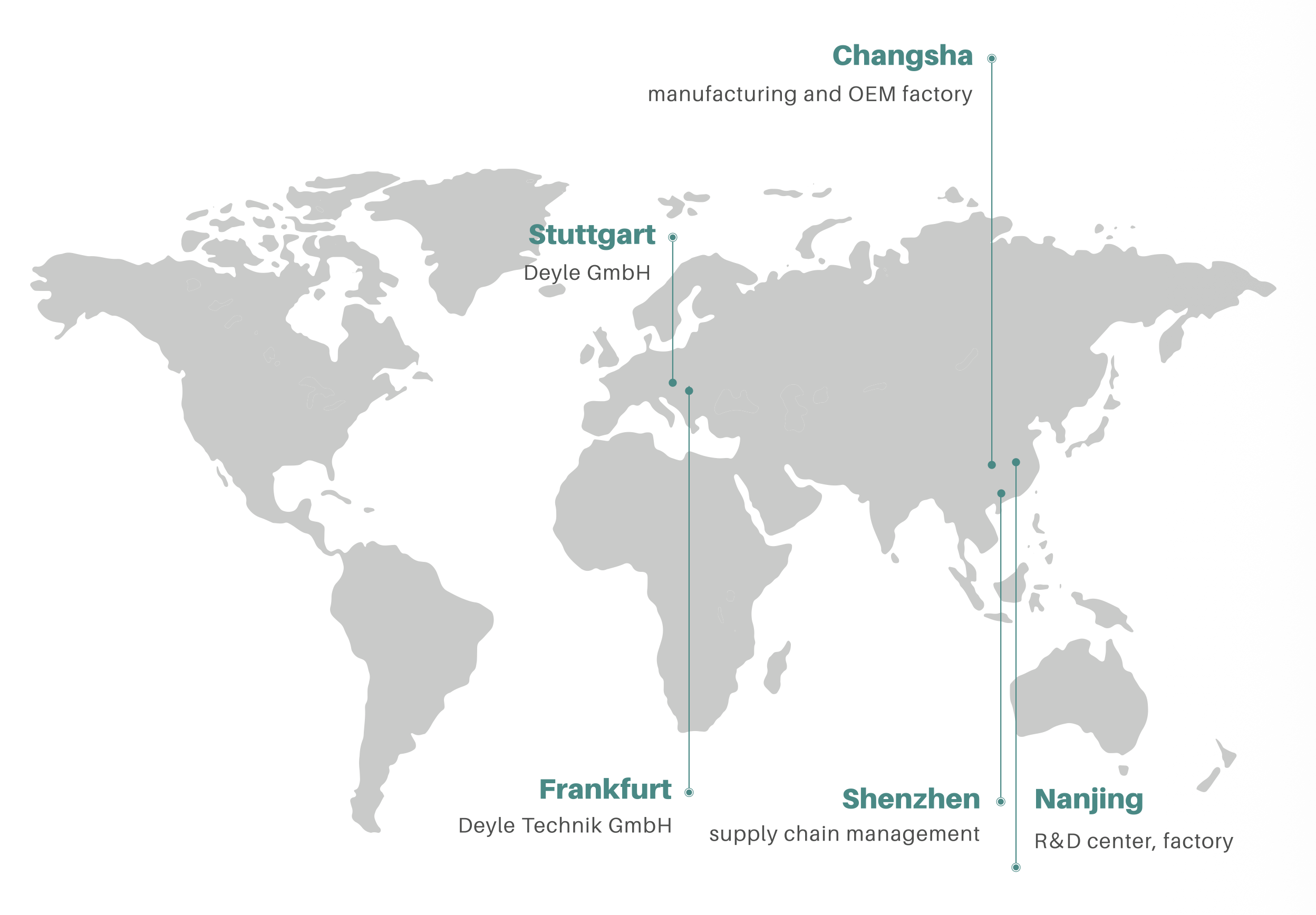 Deyle Group has offices in Stuttgart and Frankfurt, Germany, as well as in Nanjing, Changzhou, and Shenzhen, China, with approximately 200 employees. Its manufacturing and OEM factories are located in Stuttgart, Germany, and in Nanjing, Changzhou, and Changsha, China.