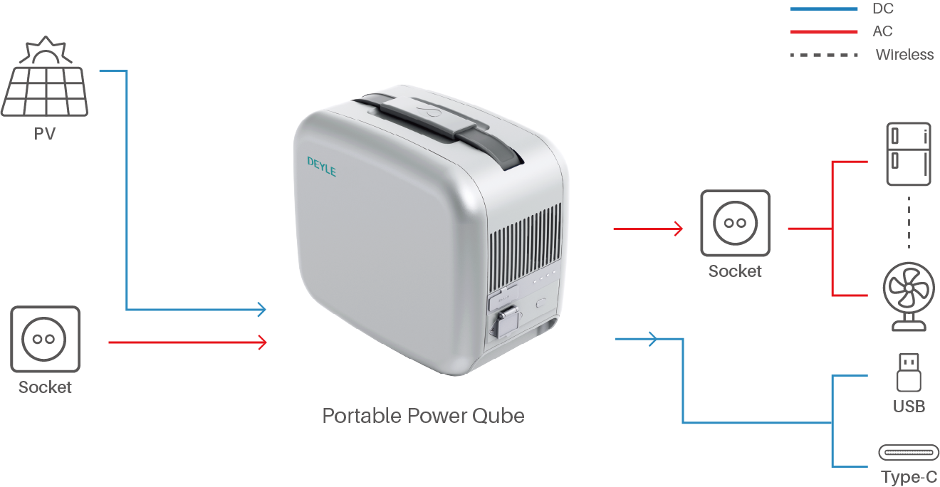 This portable power cube supports both AC and PV inputs for charging the battery. It provides 300W AC output, and 1 type-C & 2 USB DC outputs.